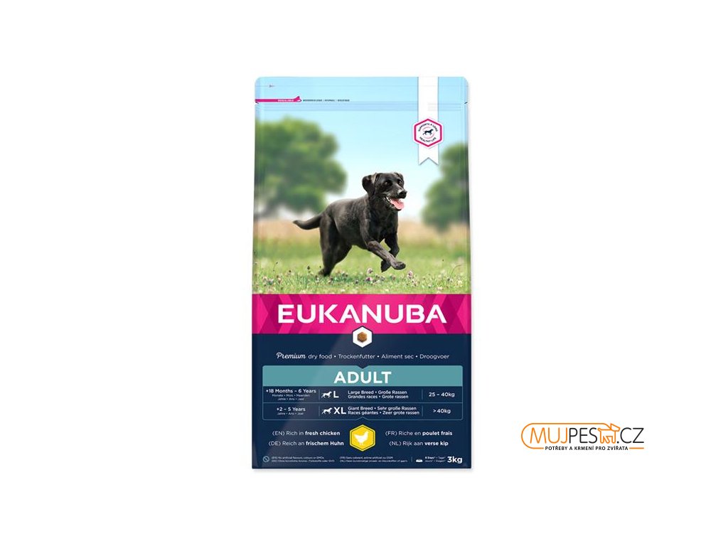 100% kompletní a vyvážené krmivo pro dospělé psy velkých a obřích plemen, kteří jsou průměrně aktivní a mají normální váhu. Kompletní krmivo pro psy velkých a obřích plemen od 1 do 6 let s váhou od 25 do 40 kg a od 2 do 6 let pro psy s váhou nad 40 kg. S bohatým obsahem kuřecího masa. Krmivo značky Eukanuba poskytuje optimální denní dávku proteinů, tuku, karbohydrátů, důležitých vitamínů a minerálů pro zdraví a pohodu vašeho psa. Tato strava obsahuje zvláštní složku FlexMobility (systém péče o klouby), jejíž výživová složka podporuje zdravé kloubní chrupavky a nízkou hladinu tuku pro udržení optimální hmotnosti a minimalizaci zatížení kloubů. Obsahuje vysoce kvalitní přísady a velké množství živočišných proteinů, z nichž kuřecí maso představuje hlavní zdroj.
