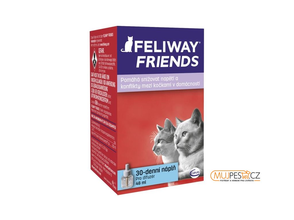 V domácnostech, kde žije více koček, může docházet k honičkám, rvačkám a dalším projevům kočičí nesnášenlivosti. Většina kočičích střetů rychle odezní, mezi některými kočkami ale může přetrvávat dlouhodobá nenávist. Pokud taková situace nastane, máme pro Vás jednoduché řešení. FELIWAY® Friends obsahuje syntetickou napodobeninu zklidňujícího feromonu, který přirozeně produkují laktující kočky a který jak u koťat, tak u dospělých koček navozuje pocit bezpečí. Elektrický difuzér rozprašuje tento hormon do prostoru a tím prokazatelně zlepšuje vztahy mezi kočkami žijícími v jedné domácnosti.