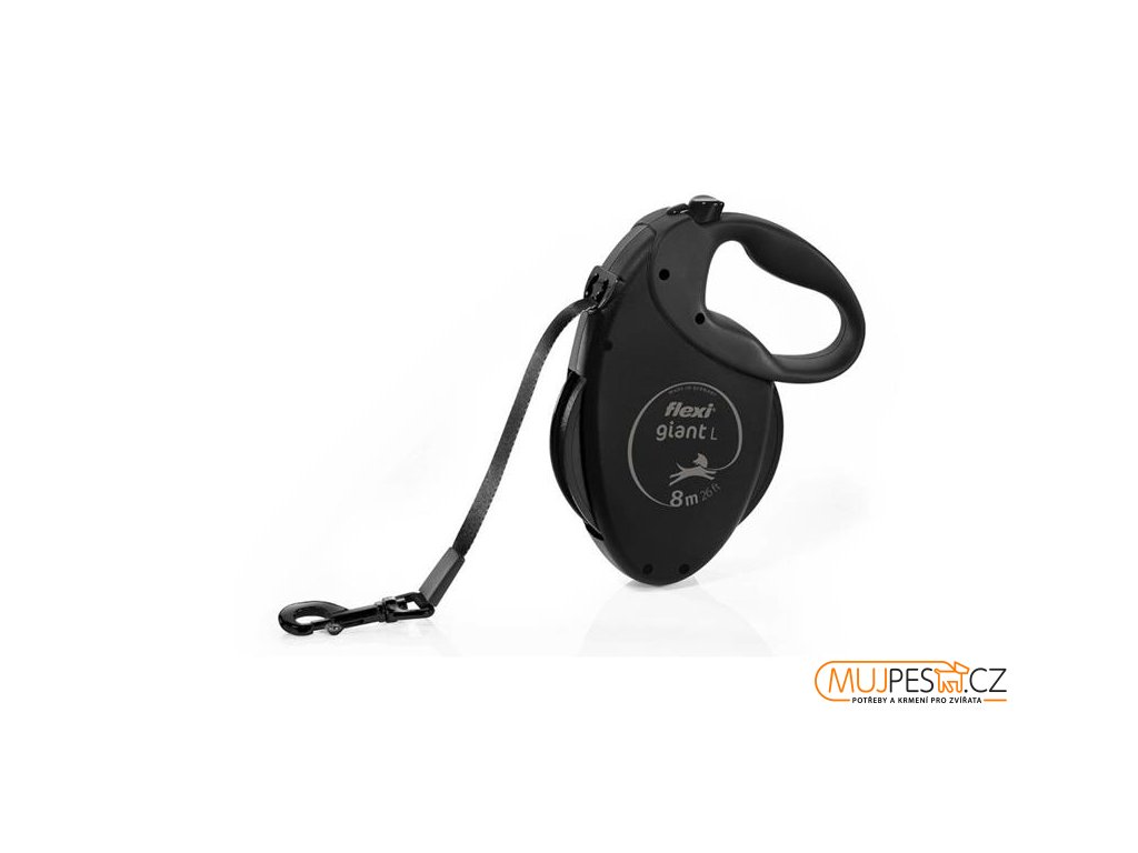 Samonavíjecí vodítko Flexi Giant Black Edition v masivním pouzdře usnadňuje vedení psa díky měkké ergonomické rukojeti a dvěma tlačítkům, brzdovému a uzamykacímu, která lze ovládat jedním prstem. Odolná páska poskytuje psovi volnost pohybu do 8 metrů. Vyzkoušená a osvědčená technologie brzdového systému zastaví pouhým stiskem tlačítka i ten nejprudší pohyb vpřed. Vodicí systém pásky byl zdokonalen bezpočtem testů, takže se páska nezasekává, ať míří jakýmkoli směrem.
