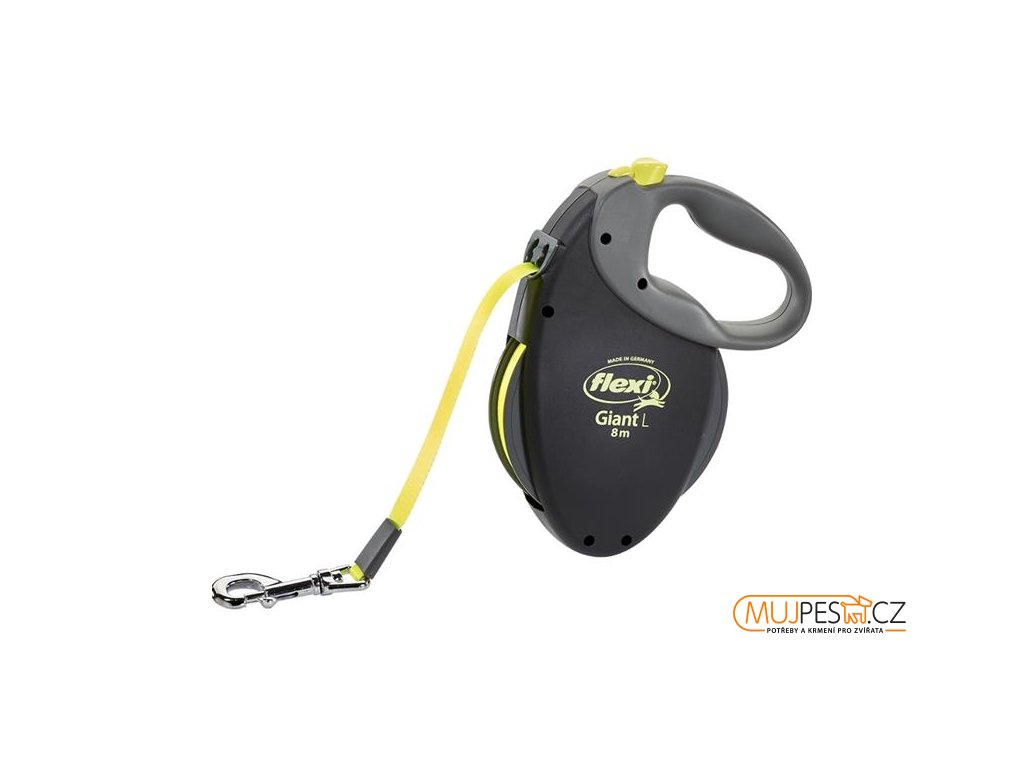 Něco mimořádného pro velké psy. Robustní vodítko Giant je snadno ovladatelné a měkká rukojeť se krásně drží. Neonový barevný pásek zajišťuje lepší viditelnost i z velké dálky. Vyzkoušený a osvědčený mechanismus v masivním pouzdře zastaví pouhým stisknutím tlačítka i nejsilnější pohyb vpřed. Vodítko prochází před expedicí mnoha kontrolami kvality.