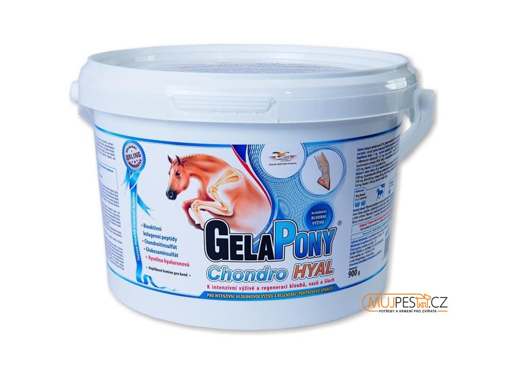 Gelapony® Chondro Hyal je doplňkové krmivo pro koně v zájmovém chovu, dostihové a sportovní - komplexní perorální chondronutraceutikum s bioaktivními kolagenními peptidy, glykosaminoglykany a kyselinou hyaluronovou k intenzivní výživě a regeneraci kloubního systému a pro zlepšení elasticko-mechanických vlastností kloubních a vazivových tkání při vysoké sportovní zátěži. Díky vysoce efektivní kombinaci účinných látek zvyšuje Gelapony® Chondro Hyal elasticitu kloubních chrupavek, vazů a šlach, obnovuje pohyblivost a omezuje bolestivost kloubů.