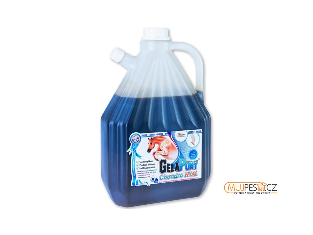 Gelapony® Chondro Hyal Biosol je doplňkové krmivo pro koně v zájmovém chovu, dostihové a sportovní - komplexní perorální chondronutraceutikum s bioaktivními kolagenními peptidy, glykosaminoglykany a kyselinou hyaluronovou k intenzivní výživě a regeneraci kloubního systému a pro zlepšení elasticko-mechanických vlastností kloubních a vazivových tkání při vysoké sportovní zátěži. Díky vysoce efektivní kombinaci účinných látek zvyšuje Gelapony® Chondro Hyal Biosol elasticitu kloubních chrupavek, vazů a šlach, obnovuje pohyblivost a omezuje bolestivost kloubů.