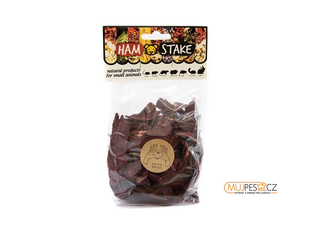 Lupínky z březového dřeva obalené sušenou červenou řepou. Vhodný materiál pro obrušování zubů a zároveň chutný bezobilný pamlsek pro všechny drobné hlodavé savce.