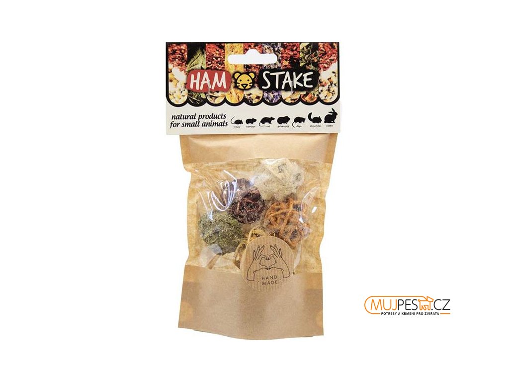 Malé křupavé grain free ratanové kuličky Ham-Stake se šesti různými příchutěmi jsou jedinečným mixem neodolatelných vůní, chutí i barev a opravdovým gurmánským požitkem pro vaše hlodavce. Každá ze šesti kuliček je obalená jinou sušenou zeleninou nebo bylinkou: od rajčete přes červenou řepu, pastinák, petržel, brokolici až po měsíček. A co víc: kuličky jsou nejen zdravým a chutným pamlskem, ale zároveň i zábavnou interaktivní hračkou, se kterou se váš malý kamarád nebude nikdy nudit. Voňavá a lahodná pochoutka ho podněcuje k aktivitě, stimuluje jeho přirozený hlodací instinkt a tím podporuje zdraví zubů. Obsahuje řadu vitamínů, minerálů a dalších zdraví prospěšných látek. Vysoké množství vlákniny podporuje správné trávení.
