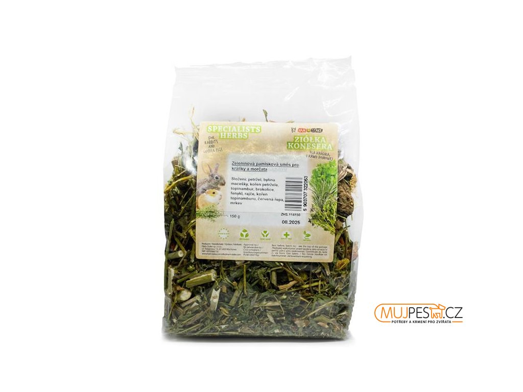 Čistě přírodní směs zeleniny a bylin je určená ke zpestření jídelníčku vašeho drobného hlodavého kamaráda. Chutnou sušenou zeleninu doplněnou bylinami můžete zvířeti opatrně nabízet z ruky jako odměnu a tím upevňovat váš vztah. Nebo můžete 1–2 kousky schovat v kleci či v ohrádce a podnítit tak u zvířete přirozený pud hledání potravy.