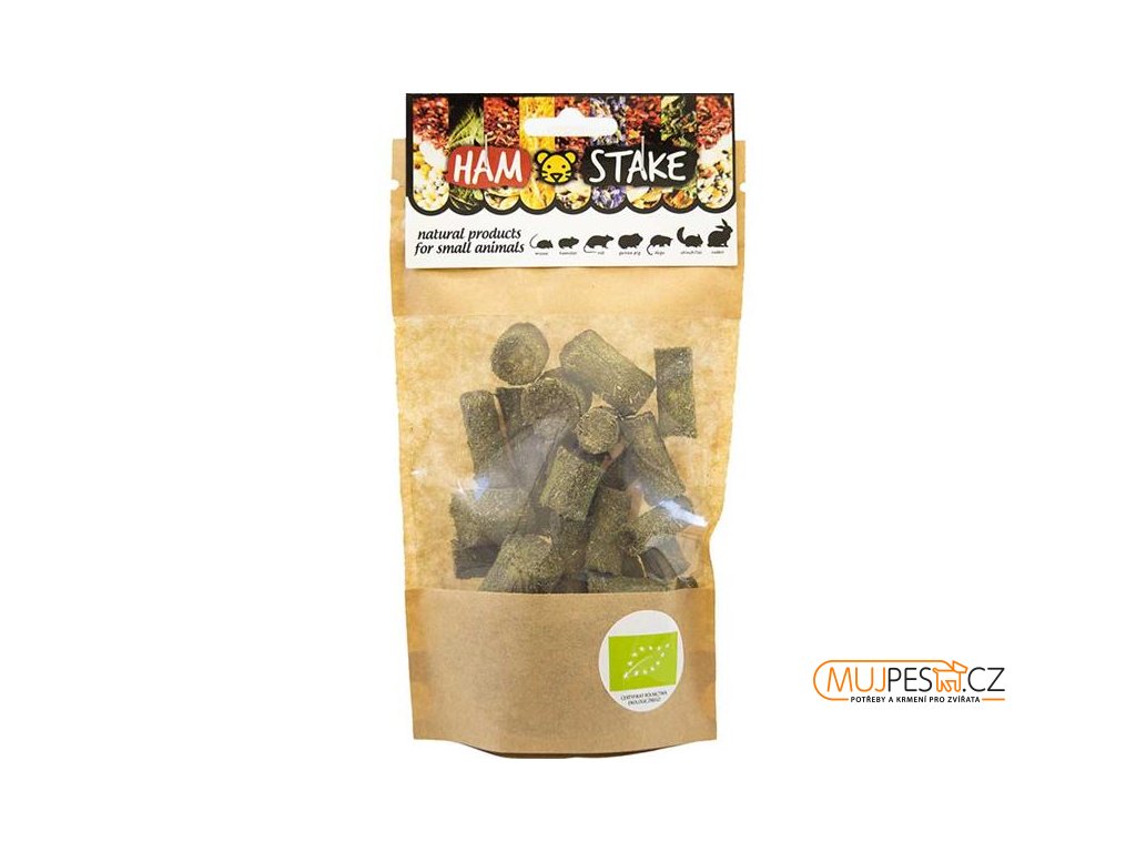 Grain free pamlsky Ham-Stake s kousky topinamburových stonků obalených voňavou sušenou petrželkou jsou ideální chutnou, křupavou a zdravou svačinkou pro králíky, morčata, osmáky, činčily, křečky, potkany, myši a pískomily. Topinamburové stonky a petrželová nať jsou vhodným zdrojem vlákniny a obsahují množství přirozeně se vyskytujících vitamínů, minerálů a dalších zdraví prospěšných látek. Topinambur upravuje zažívání, petrželka čistí organizmus, je močopudná, tlumí záněty a posiluje imunitu (vitamín C).