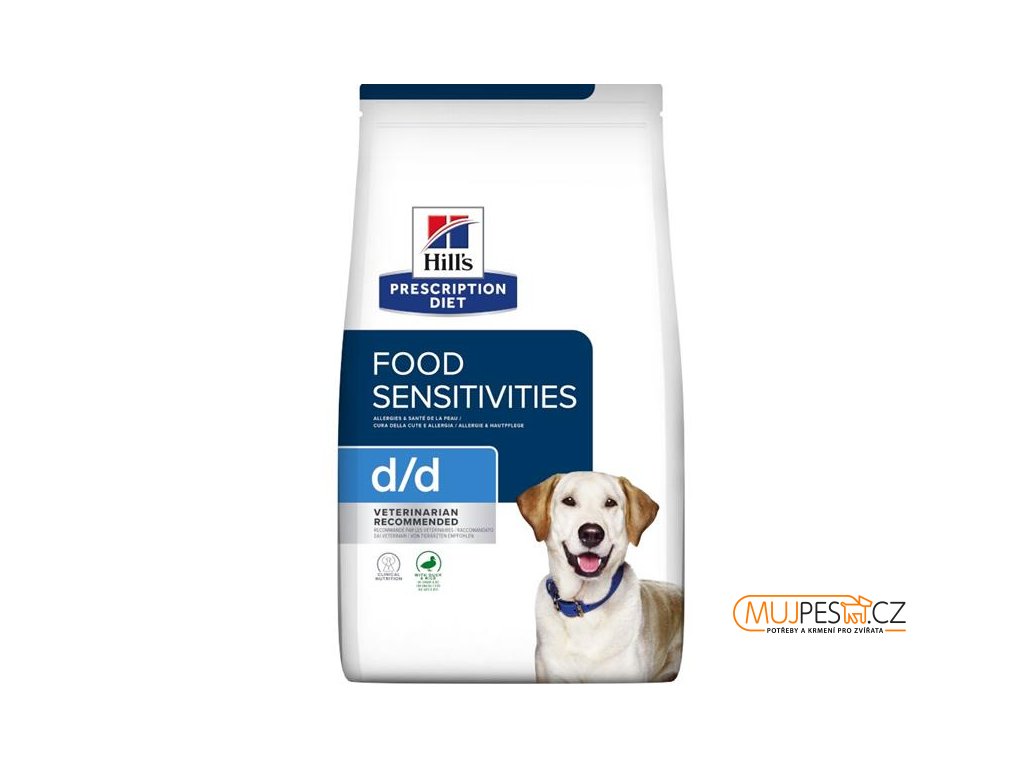 Hill´s Prescription Diet d/d s kachnou a rýží je kompletní dietetické suché krmivo pro snížení intolerance přísad a živin, na podporu funkce kůže a v případě dermatózy a nadměrné ztráty srsti u dospělých psů. Toto krmivo má vysoký obsah kyseliny linolové, kyselin EPA a DHA a také omezené množství vybraných zdrojů bílkovin a sacharidů.