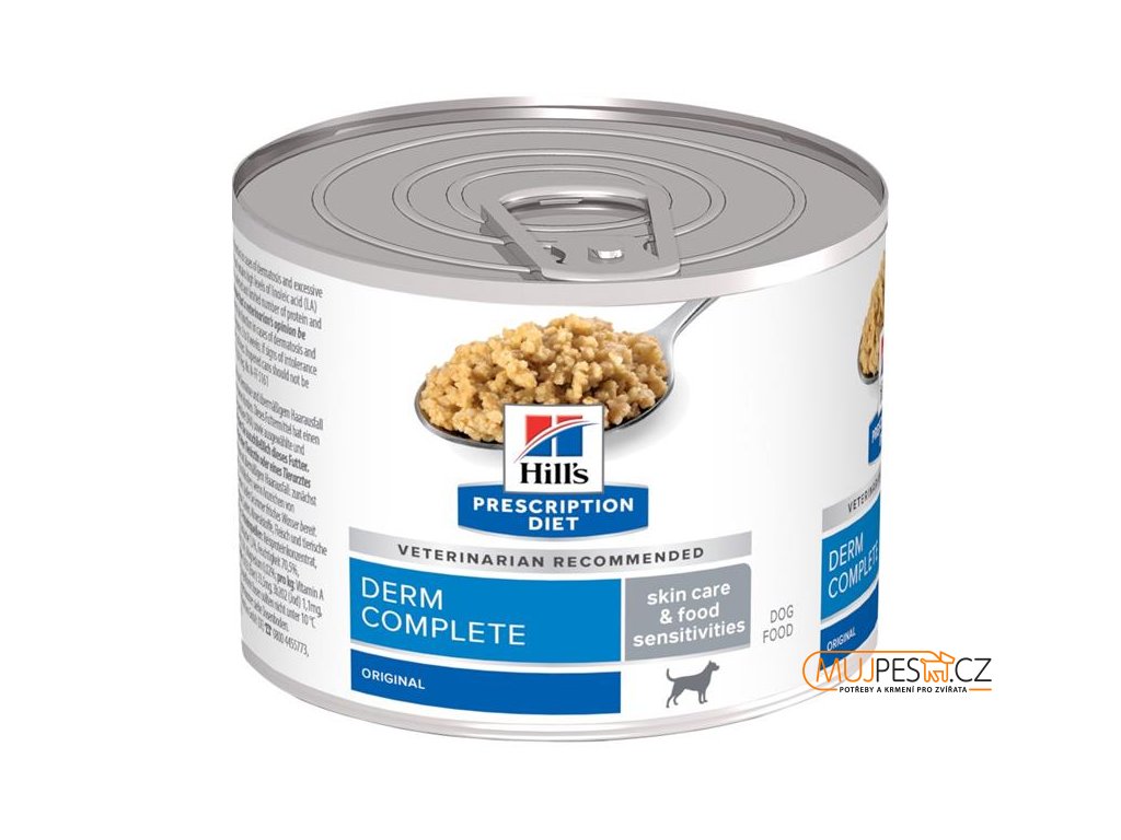 Hill's PRESCRIPTION DIET Derm Complete krmivo pro psy je kompletní dietetické krmivo pro podporu kožní funkce v případě dermatózy a nadměrné ztráty srsti a pro omezení nesnášenlivosti určitých ingrediencí a živin u dospělých psů. Toto krmivo má vysoký obsah kyseliny linolové (LA) a sumy kyseliny eikosapentaenové (EPA) a dokosahexaenové (DHA), dále obsahuje vybrané zdroje bílkovin a sacharidů v omezeném počtu.