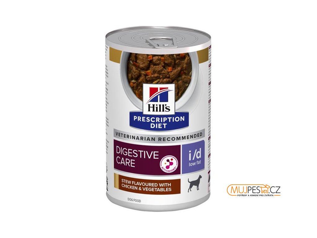 Hill's Prescription Diet i/d Low Fat psí krmivo stew s kuřetem a zeleninou je vysoce stravitelné kompletní dietetické krmivo používané ke zmírnění poruch vstřebávání živin ve střevech a ke kompenzaci špatného trávení a exokrinní pankreatické insuficience u dospělých psů. Toto krmivo má zvýšený obsah sodíku a draslíku a obsahuje vysoce stravitelné ingredience.