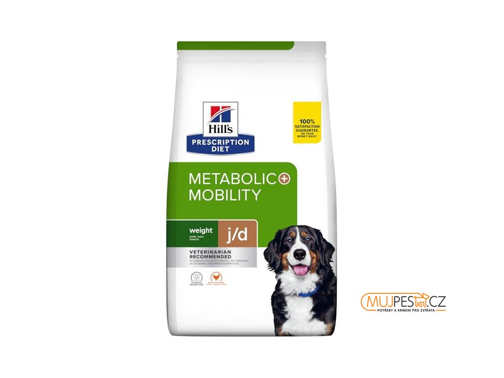 Hill’s Prescription Diet Metabolic + Mobility krmivo pro psy je dietetické krmivo, které poskytuje pomoc při kontrole hmotnosti Vašeho psa a podporuje zdraví jeho kloubů. Přirozeně pracuje s individuálním energetickým výdejem Vašeho psa pro snadné a efektivní snížení hmotnosti a může se používat dlouhodobě. Krmivo Prescription Diet Metabolic + Mobility je klinicky ověřená výživa, která pomáhá psům přirozeně snížit hmotnost a zlepšuje jejich mobilitu za pouhých 21 dní. Toto suché krmivo má lahodnou chuť kuřete, kterou Váš pes bude milovat.