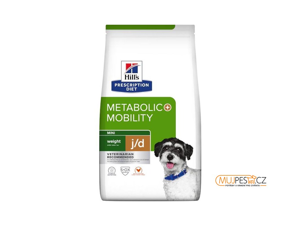 Hill's PRESCRIPTION DIET Metabolic + Mobility krmivo pro psy trpasličích plemen s kuřetem je kompletní dietetické krmivo pro snížení nadměrné tělesné hmotnosti a na podporu metabolizmu kloubů v případech osteoartritidy u dospělých psů. Toto krmivo má nízkou hustotu energie a vysoký obsah EPA, celkových Omega-3 masných kyselin a přiměřený obsah vitaminu E.