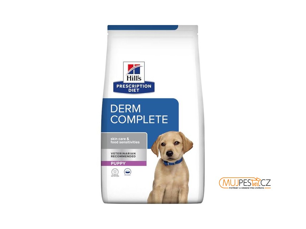 Hill´s Prescription Diet Derm Complete je kompletní dietetické suché krmivo pro štěňata na podporu funkce kůže v případech dermatózy a nadměrné ztráty srsti a také pro snížení přecitlivělosti na přísady a živiny. Krmivo má vysoký obsah kyseliny linolové, kyseliny eikosapentaenové (EPA) a dokosahexaenové (DHA) a také omezené množství vybraných zdrojů bílkovin a sacharidů.
