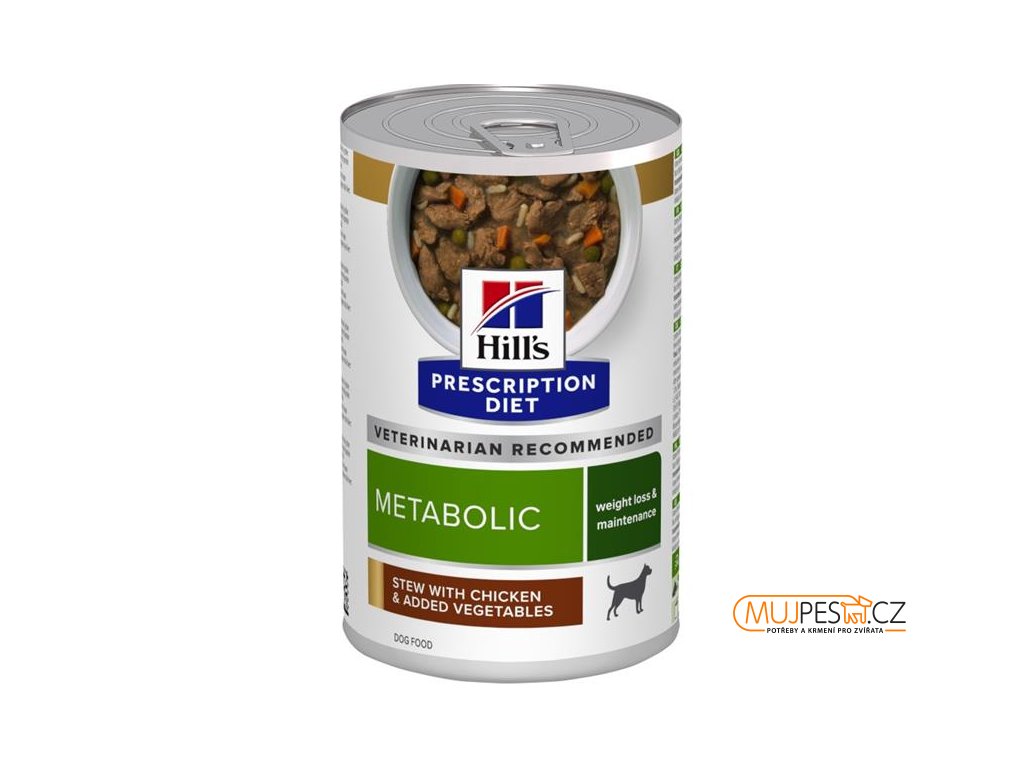 Hill’s Prescription Diet Metabolic Weight Loss & Maintenance ochucené kuřetem a zeleninou je kompletní vlhké dietetické krmivo s nízkým obsahem energie, které napomáhá snížení nadměrné tělesné hmotnosti a udržení zdravé tělesné hmotnosti dospělých psů.