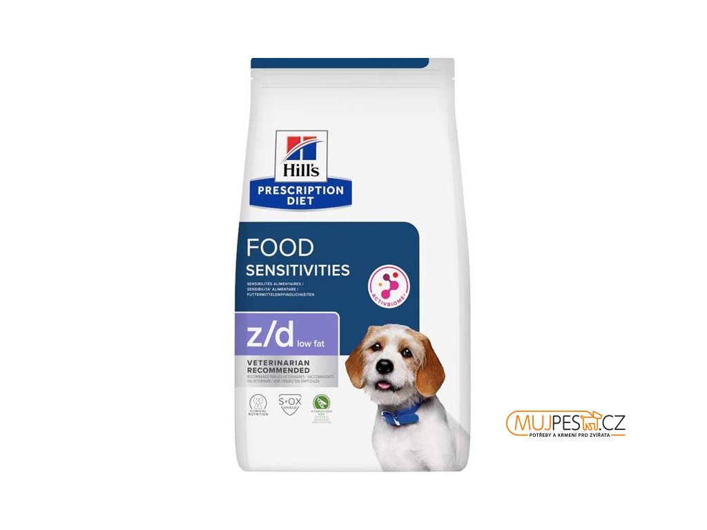 Hill’s Prescription Diet Food Sensitivities z/d Low Fat s hydrolyzovanou sójou je kompletní dietetické krmivo pro dospělé psy určené k omezení nesnášenlivosti vůči určitým ingrediencím a živinám. Krmivo obsahuje vybraný zdroj sacharidů (kukuřičný škrob) a zdroje hydrolyzovaných bílkovin (hydrolyzát sójové bílkoviny, hydrolyzát kuřecích jater). Klinicky ověřená výživa poskytuje viditelnou úlevu při přecitlivělosti na krmivo a alergeny z prostředí a je vhodná i pro pacienty se souběžným onemocněním vyžadujícím snížený obsah tuku.