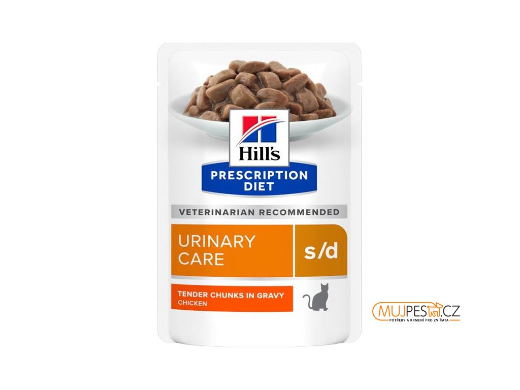 Hill's PRESCRIPTION DIET s/d krmivo pro kočky s kuřetem KAPSIČKA je kompletní dietetické krmivo pro rozpouštění struvitových kamenů u dospělých koček (příčiny onemocnění dolního močového traktu koček / FLUTD). Toto krmivo má vlastnosti okyselující moč a má nízký obsah hořčíku.