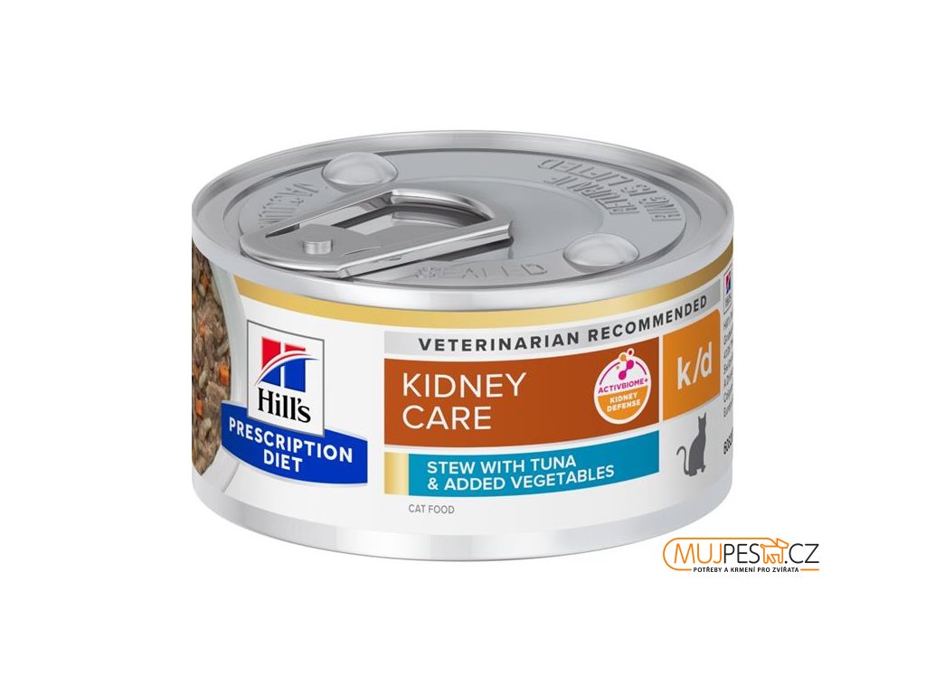 Hill's Prescription Diet Kidney Care k/d je klinicky ověřená výživa, která pomáhá chránit životně důležité funkce ledvin kočky. Obsahuje ActivBiome+ Kidney Defense, patentově chráněnou směs prebiotik, o nichž je prokázáno, že podporují střevní mikrobiom a chrání funkci ledvin. Bylo klinicky ověřeno, že tato výživa zlepšuje kvalitu života koček a prodlužuje ho. U koček se sníženou funkcí ledvin může docházet ke ztrátě chuti k jídlu a jejich příjem potravy se může snížit. Konzerva s tuňákem a přidanou zeleninou má lákavou chuť a je sestavená tak, aby pomáhala snižovat zátěž ledvin a umožňovala jim tak účinnější fungování.