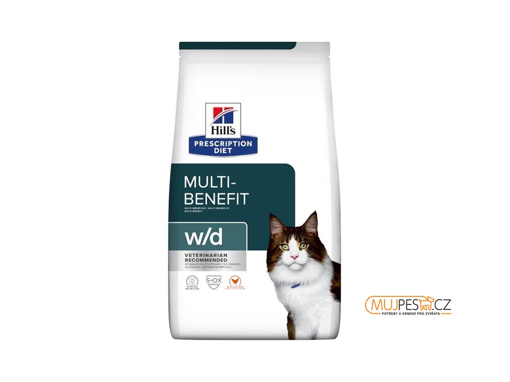 Dietní krmivo pro dospělé kočky se vyznačuje recepturou s nízkým obsahem tuku, která může pomoci snížit hladinu tuků v krvi při hyperlipidémii. Obsahuje velké množství vlákniny, která podporuje trávení. Hill's Prescription Diet w/d Multi-Benefit má nízký obsah mono- a disacharidů, čímž přispívá k regulaci hladiny glukózy.
