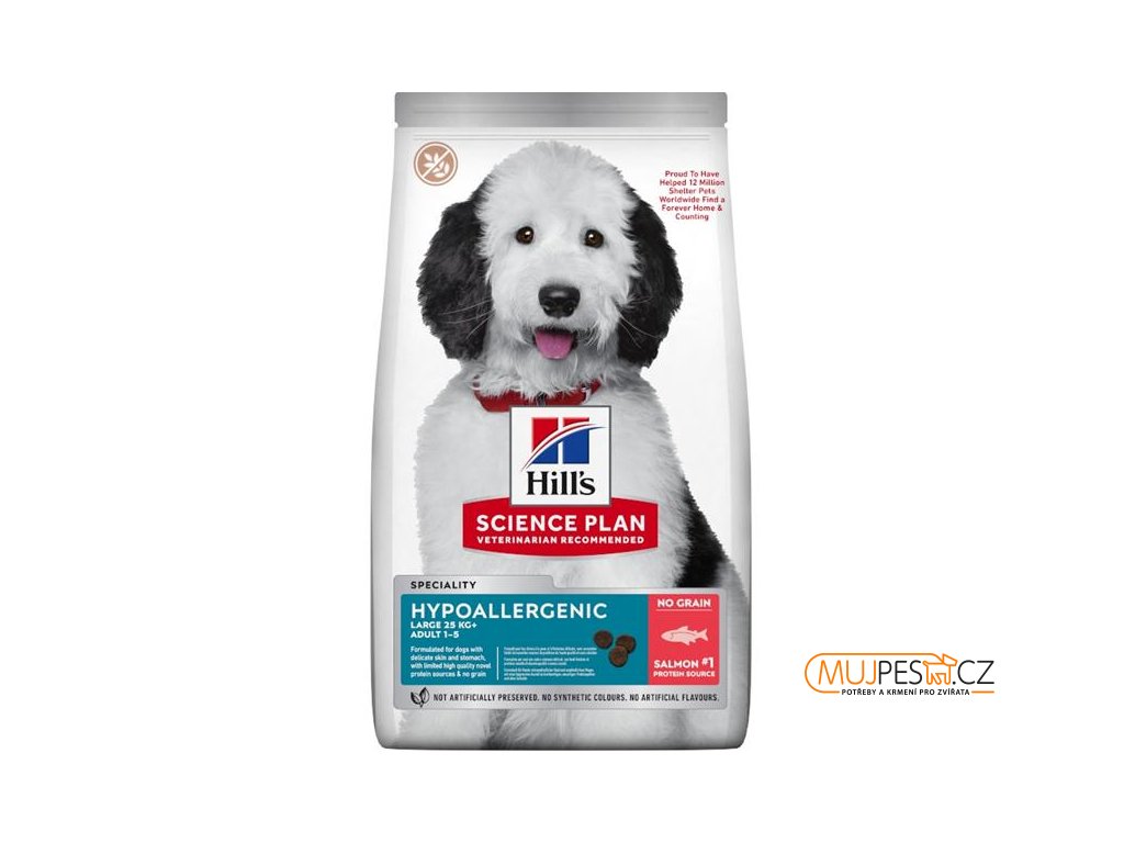 Hill's Science Plan Hypoallergenic s lososem je chutné suché krmivo pro dospělé psy středně velkých plemen ve věku 1–6 let. Díky šetrné receptuře, která obsahuje zdroje vysoce kvalitních bílkovin a žádné obiloviny, je toto lahodné hypoalergenní krmivo šité na míru potřebám psů trpících přecitlivělostí na krmivo.