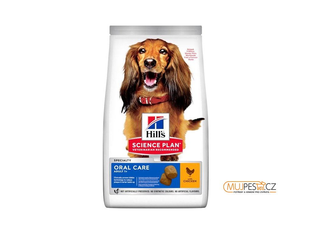 Dentální zdraví psa znamená víc než jen zuby. Podpořte celkové zdraví a vitalitu vašeho dospělého psa krmivem Hill's Science Plan Oral Care pro dospělé psy s kuřetem. Unikátní granule s klinicky ověřenou, provázanou technologií vlákniny s každým kousnutím čistí zuby a osvěžují dech. Navíc má toto prvotřídní psí krmivo vysoký obsah omega-6 mastných kyselin a vitamínu E pro každodenní podporu zdravé srsti a kůže. Tato receptura byla vytvořena na základě desetiletí špičkového výzkumu a představuje lahodnou stravu, na níž si dospělí psi skutečně pochutnají.