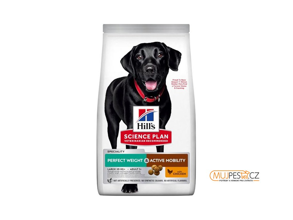 Hill’s SCIENCE PLAN PERFECT WEIGHT & ACTIVE MOBILITY LARGE BREED ADULT KRMIVO PRO PSY S KUŘETEM je kompletní krmivo pro psy velkých a obřích plemen starších 1 roku, kteří mají sklon k přibírání na váze nebo mají mírnou nadváhu, což je rizikový faktor pro problémy s mobilitou.