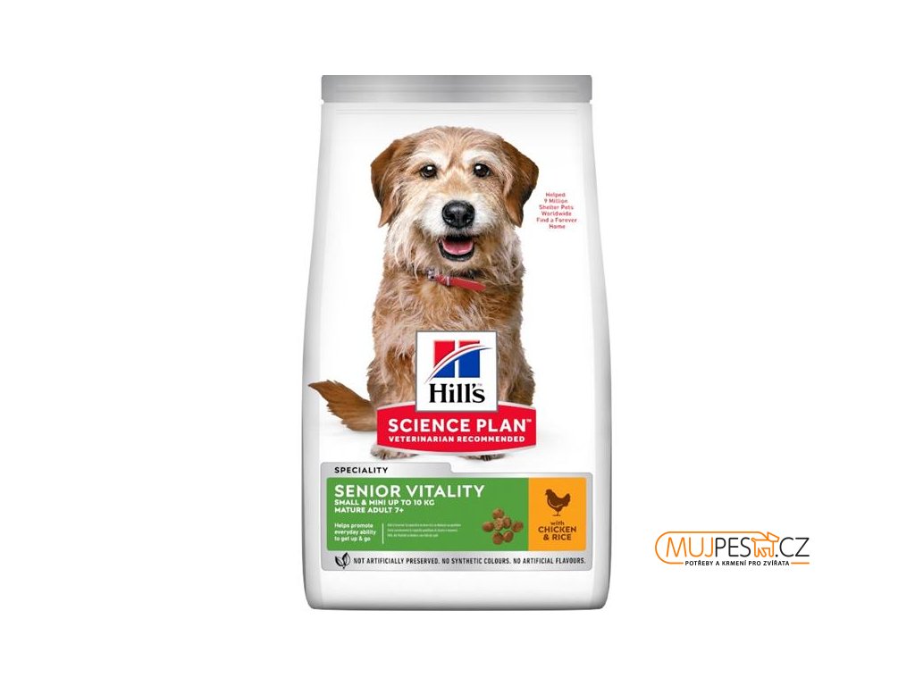 Podpořte každodenní energii a vitalitu díky přesně vyvážené výživě Hill's Science Plan Senior Vitality pro malé a trpasličí dospělé psy 7+ s kuřetem. Tato unikátní receptura s jedinečnou směsí ingrediencí představuje krmivo, na kterém si malí psi od 7 let skutečně pochutnají. Díky omega-3 a -6 mastným kyselinám a lehce stravitelným ingrediencím toto psí krmivo vyrobené z přírodních surovin podporuje zdravou srst a zdravé trávení Vašeho pejska. To ale není vše — přesně vyvážené ingredience podporují funkci mozku, interakci a energii Vašeho staršího pejska.