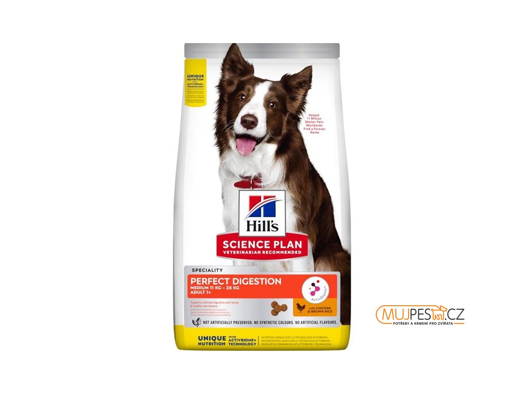Krmivo Hill's Science Plan Perfect Digestion pro dospělé psy středních plemen s kuřetem a hnědou rýží je kompletní krmivo pro dospělé psy starší 1 roku.