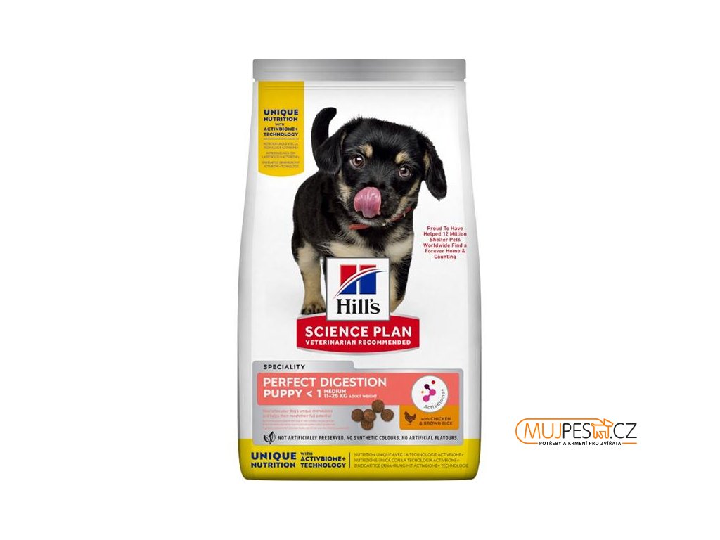 Hill's Science Plan Perfect Digestion krmivo pro štěňata obsahuje ActivBiome+, což je exkluzivní směs prebiotik společnosti Hill's, která vyživuje unikátní střevní mikrobiom vašeho psa a pomáhá mu dosáhnout jeho plného potenciálu.