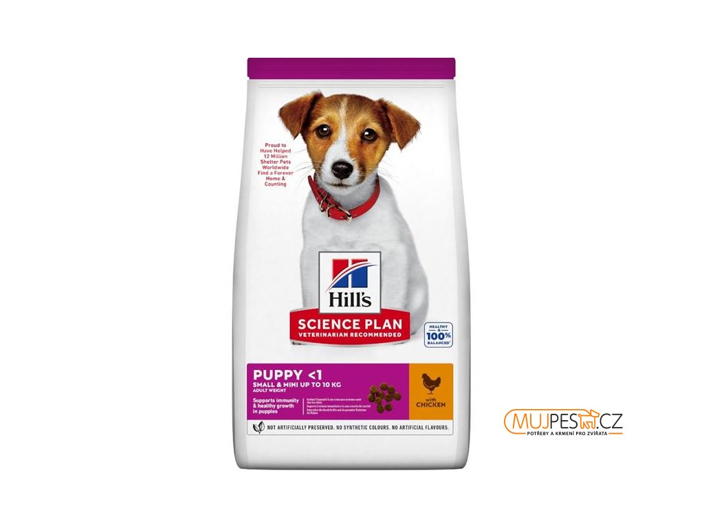 Hill's Science Plan krmivo pro malá a trpasličí štěňata s kuřetem je vytvořeno speciálně pro potřeby malých a trpasličích štěňat ve vývinu, a to do 1 roku věku. Toto prvotřídní krmivo je k dostání v malé velikosti granulí vytvořené speciálně pro vaše štěňátko. Podporuje vývoj mozku a očí díky DHA z rybího tuku, zatímco vysoce kvalitní bílkoviny pomáhají štěněti vytvářet si silné svalstvo. Jelikož je pro štěňata velice důležitý vývoj kostry, obsahuje krmivo vyvážené minerální látky pro silné zuby a zdravé kosti. A jelikož mají psi malých plemen vlastní podporu imunitního systému, obsahuje Hill's Science Plan pro malé a trpasličí psy jedinečnou směs antioxidantů.