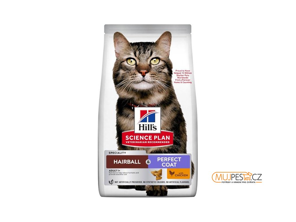 Hill’s Science Plan Hairball & Perfect Coat s kuřecím masem je kompletní suché krmivo pro dospělé kočky od 1 roku. Díky pokročilé technologii využívající vlákninu pomáhají granule předcházet potížím s trichobezoáry – napomáhají přirozenému průchodu trichobezoárů střevem. Krmivo obsahuje omega-6 mastné kyseliny podporující lesk srsti a zdraví kůže.