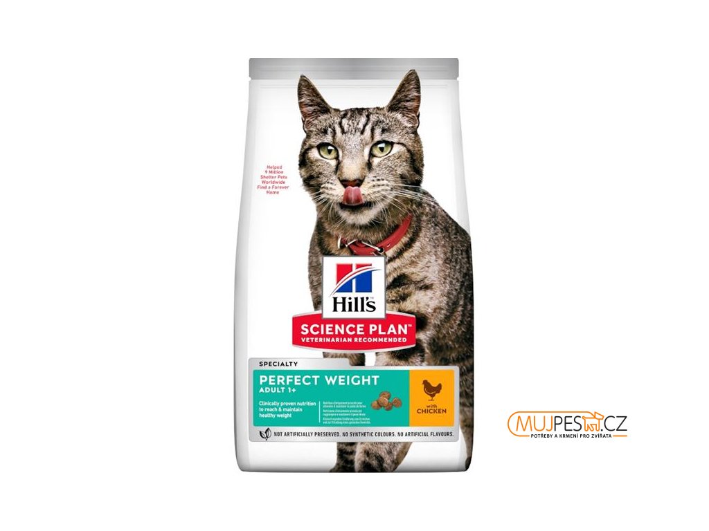 Ať má vaše kočka viditelný problém s hmotností, nebo se jen chcete ujistit, že si zdravou váhu udrží, granule Hill's Science Plan Perfect Weight poskytnou vaší dospělé kočce lahodnou průlomovou výživu pro regulaci hmotnosti. Toto pikantní krmivo s kuřecí příchutí vaší kočce pomůže udržet si dlouhodobě zdravou hmotnost. Toto krmivo pro kočky je vyrobeno z vysoce kvalitních surovin a poskytuje vysoce kvalitní bílkoviny, které u vaší kočky navodí pocit nasycení mezi krmením a zároveň zachovají svalovou hmotu. Díky novému vzhledu HILL'S SCIENCE PLAN má vaše kočka ještě víc, nač se těšit.