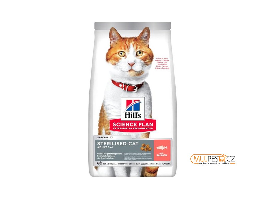 HILL'S SCIENCE PLAN Sterilised Cat suché kompletní krmivo s lososem má unikátní složení pro regulaci hmotnosti a pomáhá tak udržovat štíhlost u kastrovaných koček ve věku 1–6 let. Je vyrobeno z vysoce kvalitních, snadno stravitelných surovin, s přidaným L-karnitinem, u něhož je klinicky prokázáno, že kočkám pomáhá, aby zůstaly štíhlé a aktivní. Kontrolovaný obsah minerálů podporuje zdraví močového systému. Nízký obsah tuku a vysoký obsah L-lysinu pomáhají udržet vitalitu.