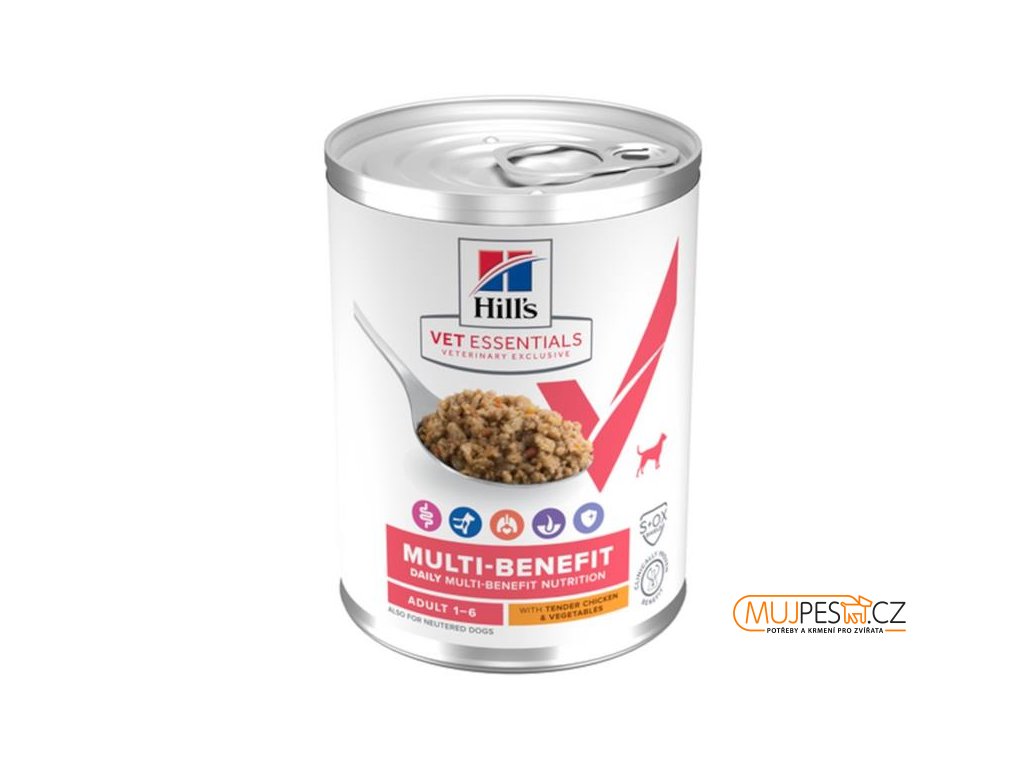 Hill's Vet Essentials Multi-Benefit Adult s křehkým kuřetem a zeleninou je kompletní víceúčelové krmivo pro dospělé psy ve věku 1–??????6 let. Konzerva poskytuje všestranně prospěšnou výživu s klinicky ověřenými přínosy. Bez umělých konzervantů, syntetických barviv a umělých příchutí.
