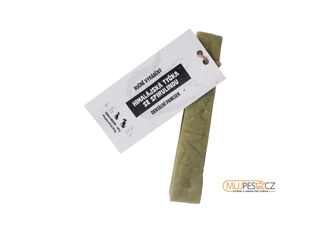 Himalájská tyčka se spirulinou je odolná žvýkací dobrota z kvalitního belgického mléka sušeného po dobu 3 měsíců. Výsledkem je extra tvrdý dentální pamlsek, který si váš pes zamiluje. Spirulina podporuje správnou funkci štítné žlázy a přirozenou imunitu psa, tlumí plynatost, snižuje riziko zánětů, urychluje rekonvalescenci a potlačuje zápach z tlamy.