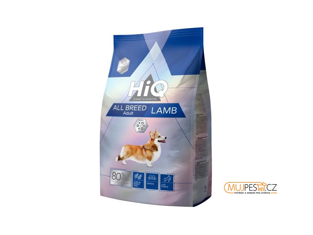 Kompletní krmivo HiQ pro dospělé psy všech plemen obsahuje bílkoviny z jehněčího masa, které vyhovují potřebám organismu a udržují správnou energetickou rovnováhu. Neobsahuje pšenici a kukuřici, proto je vhodné pro psy s citlivým zažíváním nebo trpící nesnášenlivostí lepku. Krmivo podporuje snadné trávení a vstřebávání živin. Komponenty krmiva napomáhají zachovat lesk a hustotu srsti a také podporují zdraví pokožky. Zároveň podporují udržení optimální hmotnosti psa.