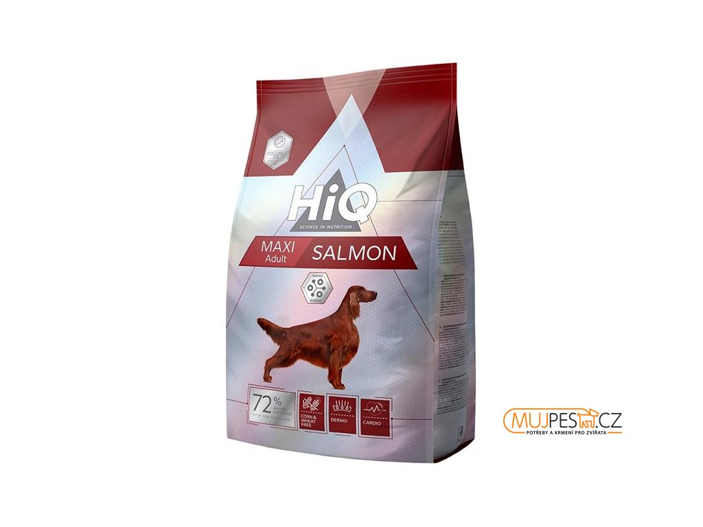 Kompletní krmivo HiQ pro dospělé psy velkých plemen s lososem je vhodné pro psy nad 25 kg váhy. Obsahuje vysoce kvalitní bílkoviny z lososa, které zajišťují zachování lesku a hustoty srsti a zároveň podporují zdraví pokožky. Neobsahuje pšenici a kukuřici, proto je vhodné pro psy s citlivým zažíváním nebo trpící nesnášenlivostí lepku. Krmivo napomáhá snadnému trávení a vstřebávání živin. Podporuje zdraví kostí a kloubů a dodává potřebné vitamíny a minerály. Pečuje o správné fungování srdeční činnosti a také o imunitu psa.