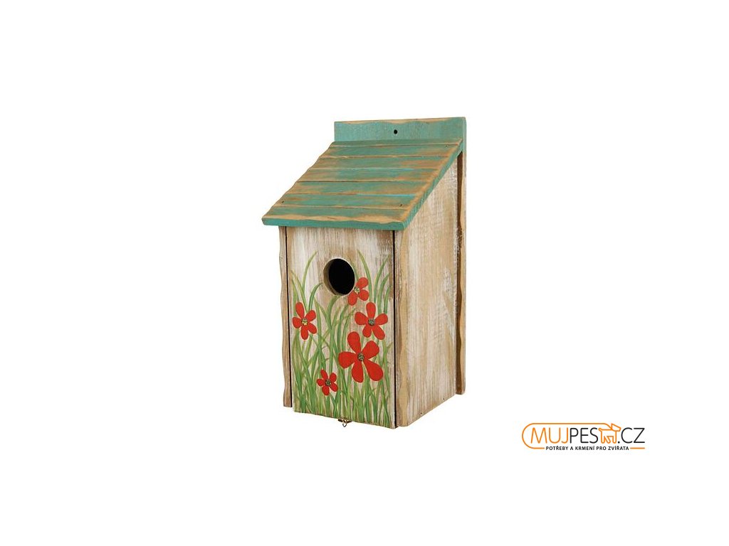 Hnízdící budka je ze dřeva a umisťuje se na zahradu na pevné místo.