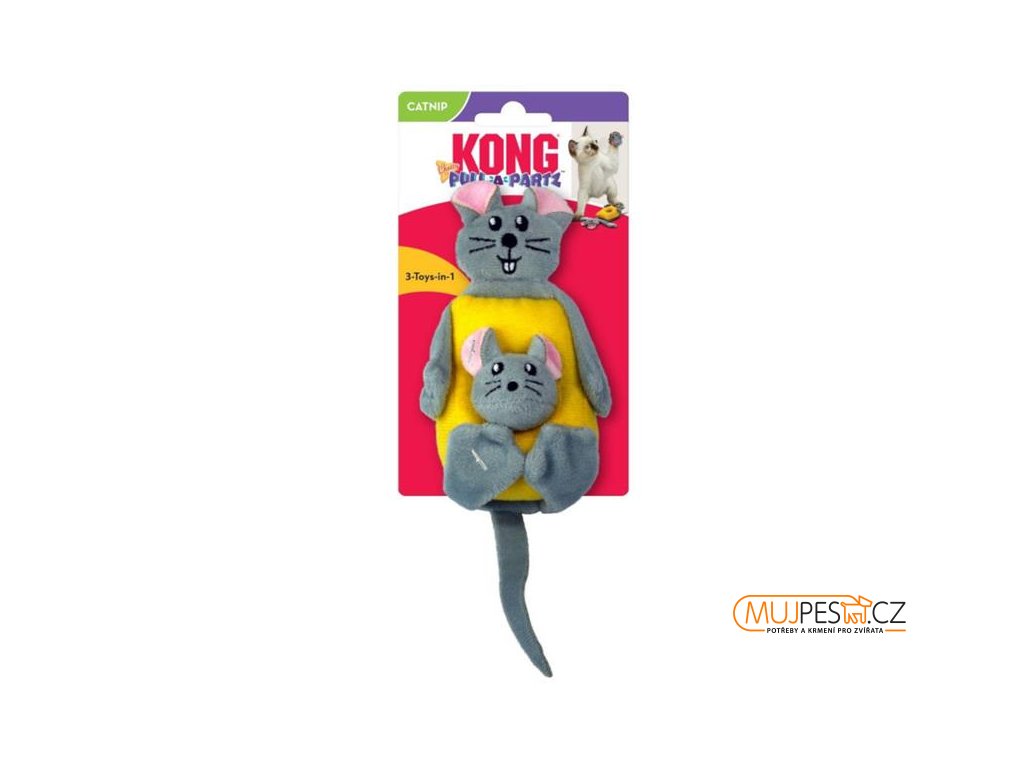 S roztomilou hračkou KONG Pull-A-Partz 3 v 1 zažijí vaše kočky nekonečné množství zábavy a dobrodružství při jejím rozebírání na jednotlivé části a objevování ukrytých hraček. Velká šustivá myš s dlouhými končetinami i ocáskem přímo vybízí k zápasu celým tělem i ke kopání zadními tlapkami, zatímco odnímatelný sýr i malá myška v něm ukrytá uspokojí přirozené lovecké instinkty chytání a vyhazování kořisti. Pro větší vzrušení i radost ze hry jsou hračky naplněny magickou šantou kočičí (catnipem), přírodní nenávykovou bylinou, která povzbuzuje ke hře až 70 % koček.