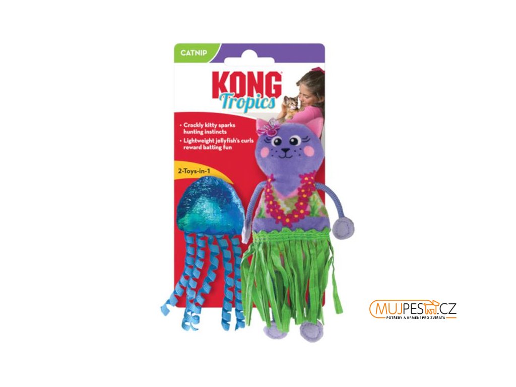Svůdná kočičí tanečnice s šustivým tělíčkem, třepetající sukýnkou a extrémně pohyblivými končetinami i výrazně třpytivá medúza s lehoučkými zvlněnými chapadly, to všechno je hračka KONG Cat Tropics 2 v 1 pro kočky. Poskytuje jim dvojnásobné potěšení ze hry s možností libovolně obměňovat lovecké manévry a zabaví je na celé hodiny. Podporuje tak udržení dobré fyzické i psychické kondice vašich domácích mazlíčků. Obě hračky navíc obsahují magickou šantu kočičí (catnip), přírodní nenávykovou bylinu, která povzbuzuje ke hře až 70 % koček.