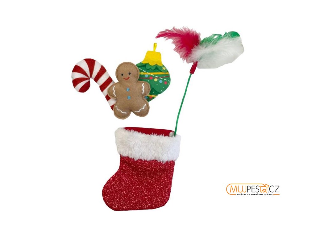 Vánoční punčocha obsahuje čtyři hračky (textilní perníček, lízátko a ozdobu a péřovou vábničku), s nimiž si vaše kočka může hrát mnoha způsoby. Ideální jako dárek pod stromeček.