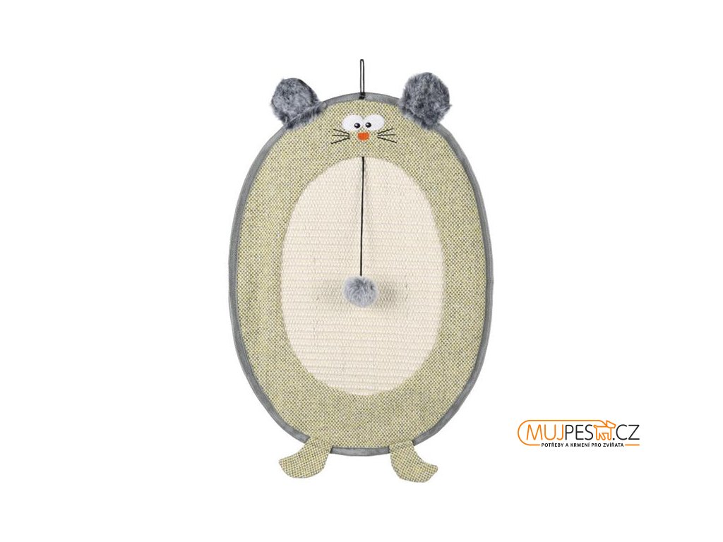 Nástěnné škrabadlo láká kočky sisalovou škrabací plochou, chlupatýma ušima a cinkající bambulkou na provázku. Hračka má poutko pro zavěšení.