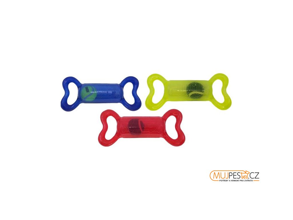 Gumová hračka z odolného materiálu je vhodná pro přetahování, energické lomcování i aport. Na obou koncích hračky jsou madla pro pevný úchop. Držení usnadňuje a zpříjemňuje také jemně texturovaný povrch. V dutém středu hračky se volně pohybuje tenisový míček, který při stisknutí hlasité píská. Díky pohybům míčku sebou hračka nepředvídatelně cuká, což ještě zvyšuje vzrušení ze hry.