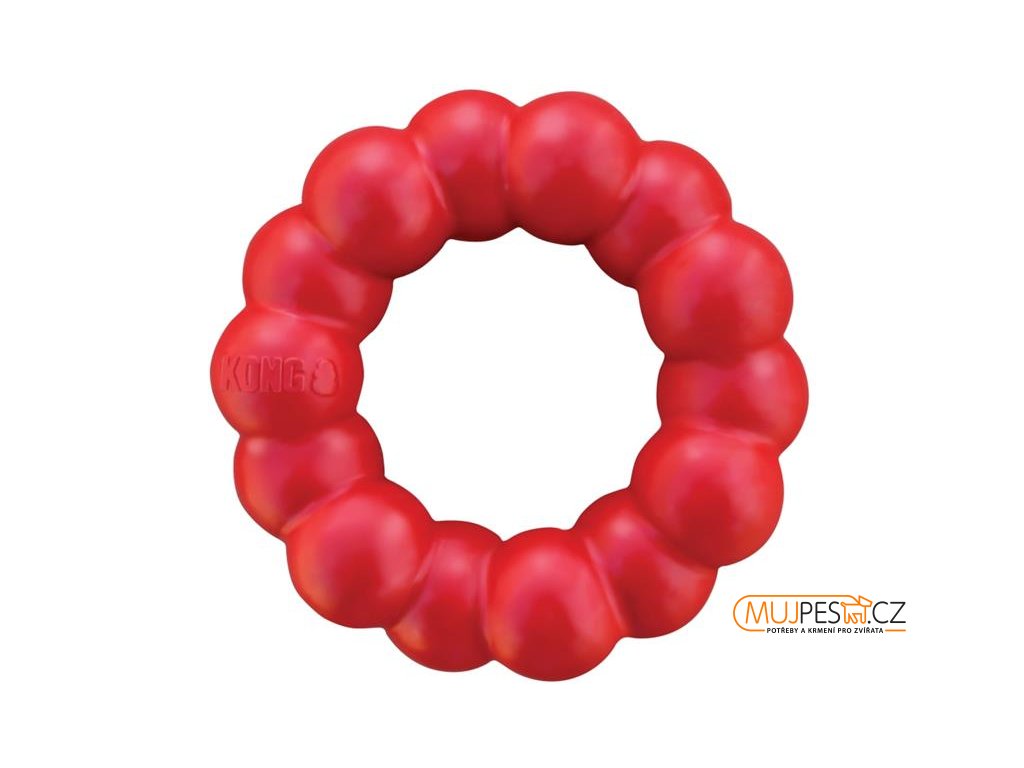 Gumová hračka KONG Kruh pro psy ze speciální, odolné gumy. Je vyrobená z ultra elastického, čistě přírodního kaučuku, který je velmi pružný a zároveň velmi odolný a pevný i pro největší ničitele hraček. Hračka má atraktivní tvar i povrch. Masážní výstupky psi milují, pomáhají jim čistit zuby, masírovat dásně a posilovat žvýkací svalstvo. Nerovný povrch je mnohem zábavnější než povrch hladký. KONG k výrobě hraček používá přírodní gumu, která je šetrná k zubům, odolná a netoxická.