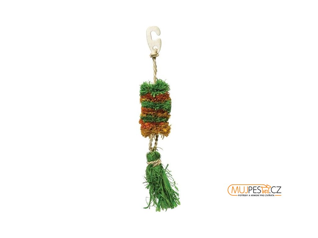 Girlanda z kukuřičného šustí a mohutným střapcem na sisalovém provázku. Hračka je opatřena dřevěným háčkem pro snadné umístění v kleci.