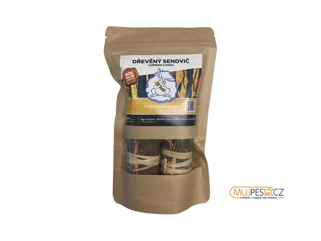 Špalíček dřeva z ovocného stromu podélně rozříznutý, naplněný plátky sušené mrkve a jablka a převázaný lýkem. Chutný a zábavný materiál k okusu pro králíky, morčata a další hlodavce, kteří potřebují hlodat.