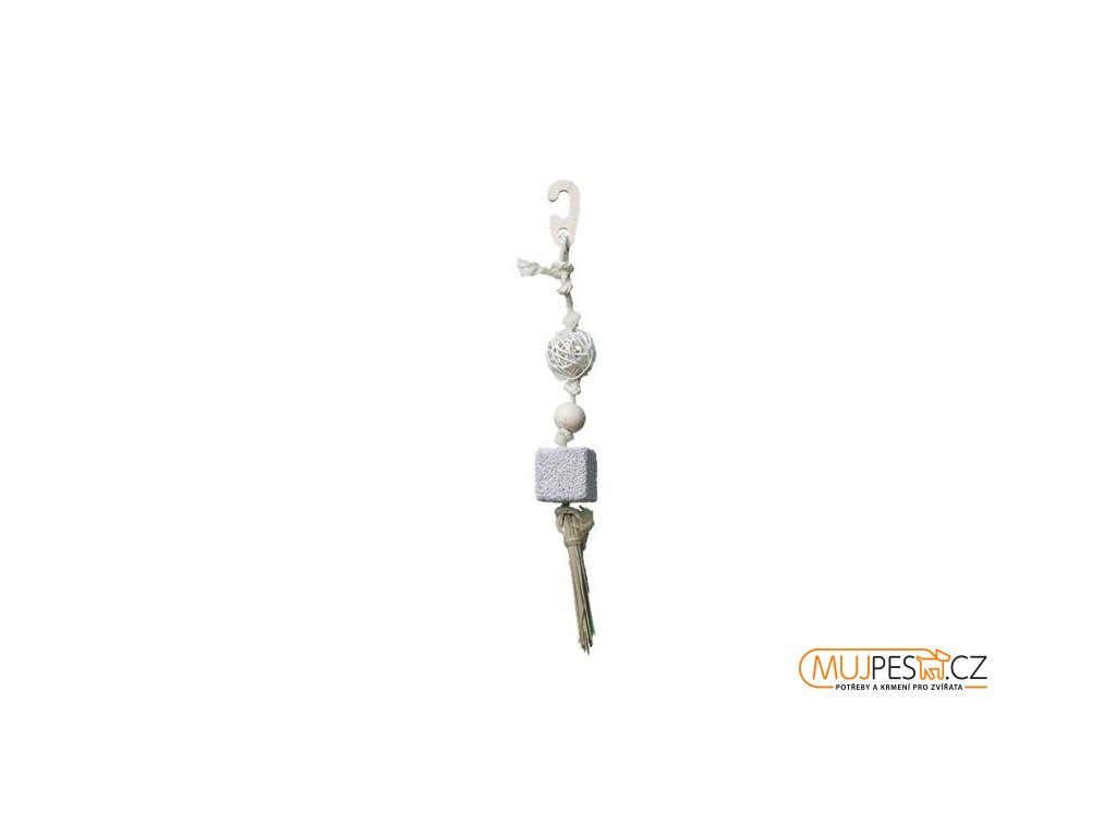 Hračka pro králíky a hlodavce je vyrobená z různých přírodních materiálů. Nabízí několik hlodacích prvků, které přinášejí pestrost a stimulaci. Vaše zvíře si s ní bude rádo hrát a okusovat ji. Podporuje přirozené hlodací chování a pomáhá naplnit potřebu obrušování zubů. Snadno ji zavěsíte do každé klece nebo jiné ubikace.