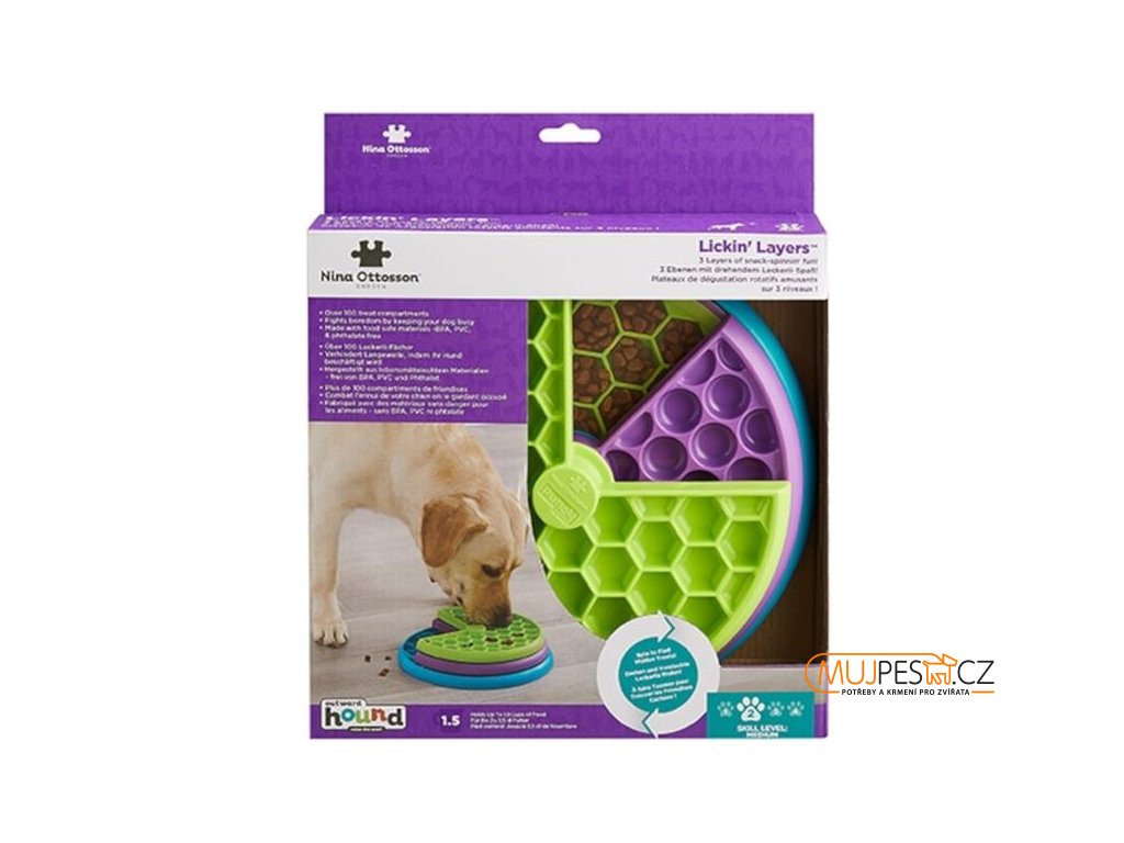 Hračka z dílny Niny Ottosson tříbí psí intelekt, zahání nudu a pomáhá omezit destruktivní chování. Slouží také jako zpomalovač krmení – zabraňuje nezdravému hltání. Má stabilní základnu a lze použít na suché i mokré krmivo. Je vhodná pro psy všech plemen, velikostí a věkových skupin.