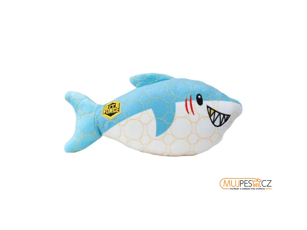 Z hlubin moře k vám připlouvá Bite Force Shark, hračka navržená speciálně pro psy milující kousání a žvýkání. Díky zesíleným švům, odolným tkaným vrstvám a kevlarovému vláknu vzdoruje ostrým psím zubům. Kevlar vyniká dlouhou životností a je široce používán v policejním, armádním a leteckém průmyslu pro svou výjimečnou odolnost v tahu. Pro ještě větší vzrušení ze hry má hračka zabudované pískátko a šustivou část. Kousáním hračky si pes čistí zuby, posiluje čelist a zmírňuje případný stres či úzkost. Žralok je vhodný pro hraní uvnitř i venku, kde ho díky výrazným barvám neztratíte.