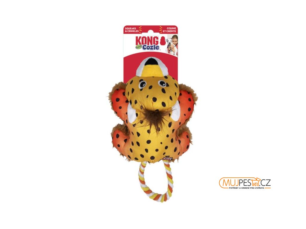 Hračka pro psy KONG Cozie Tuggz Cheetah je roztomilý barevný gepard s provazovou rukojetí – smyčkou ze silného bavlněného lana, jehož konce vytvářejí uzel vnořený do gepardího těla. Po skousnutí vydává hračka pískavé zvuky. Břicho a vnitřní stranu končetin pokrývá hebký a měkký plyš, zatímco ostatní části jsou vyrobeny z látky. Hračka dokonale uspokojují přirozené psí instinkty a zabaví na dlouhé hodiny. Konstrukčně je uzpůsobena k přetahování, díky vyztužené plyši a silné a pevné látce odolá i zuřivému třepání a lomcování, náruživému okusování i obyčejnému mazlení. Pískání upoutá zájem vašeho psa a povzbudí ho k další hře. Hračku lze snadno přenášet v tlamě a její měkké tělo je příjemné na okusování a šetrné k zubům i dásním. Velikost S/M je vhodná pro štěňata a psy menších a středních plemen.