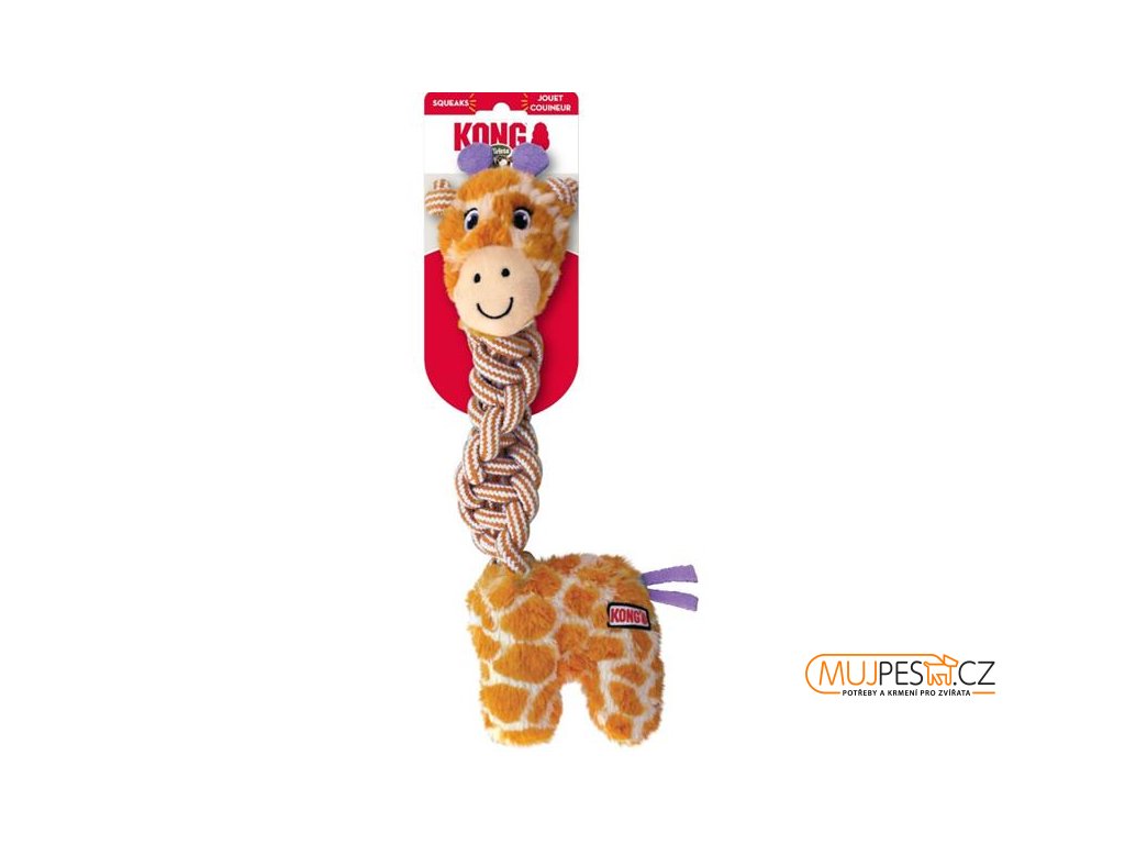 Roztomilá barevná hračka pro psy KONG Knots Twists je plameňák/žirafa vyrobené z různorodých materiálů, který podněcuje přirozené psí instinkty a tříbí jejich smysly. Dlouhý pohyblivý provazový krk, kolem něhož se ve spirále ozdobně obtáčí silné bavlněné lanko, láká k okusování, třepání a drancování. Díky měkké, ale přitom pevné přízi, ze které je lano spleteno, je tato hračka šetrná k zubům i dásním, ale zároveň velice odolná vůči zničení. Navíc žvýkáním lana si vaši psi čistí zuby. Ostatní části těla plameňáka/žirafy jsou plyšové, hebké a jemné na dotek i skus, a vycpané malým množstvím výplně – v případě protržení se nemusíte bát velkého nepořádku. Hračka navíc vydává pískavé zvuky, které stupňují zvědavost a vzrušení a nabádají k další hře. Má mnohostranné využití a lze ji snadno přenášet v tlamě. Svými rozměry (velikost M/L) vyhovuje psům středních a větších plemen.