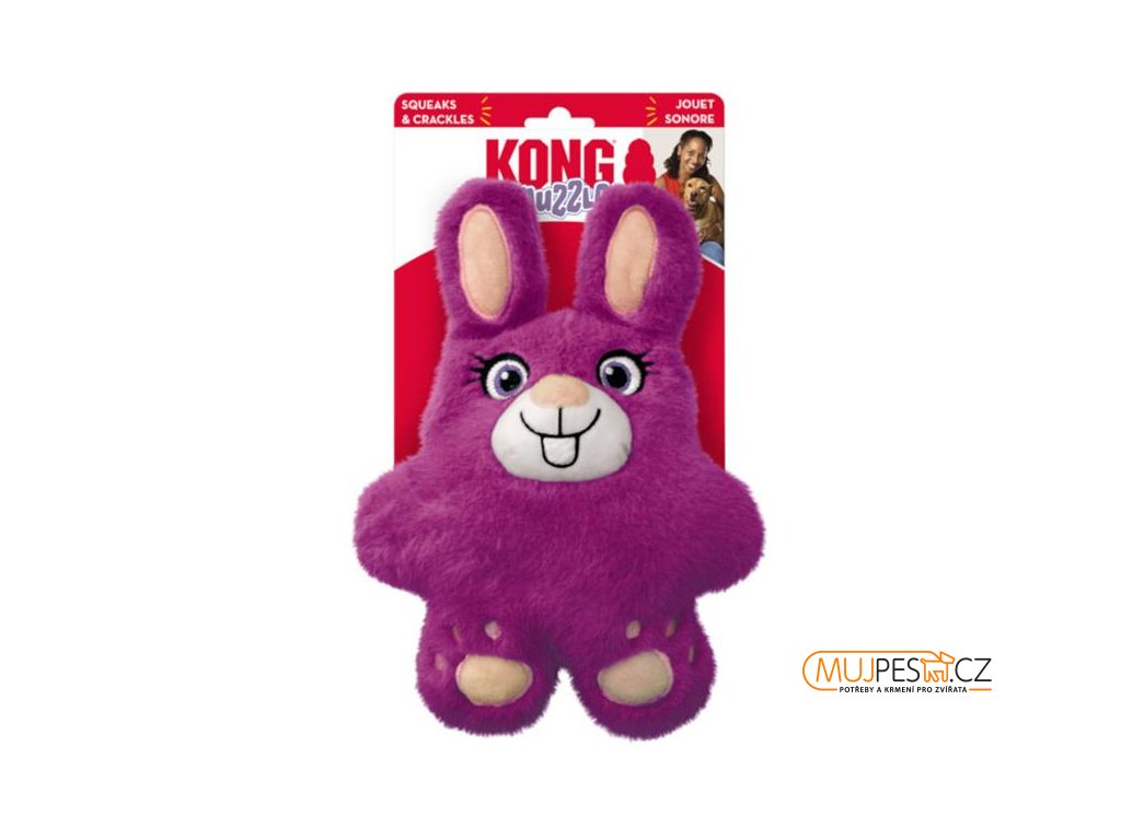 KONG Snuzzles Bunny pro psy připomíná malého baculatého králíka zploštělého do tvaru polštáře s výrazně vyčnívajícím sametovým čumákem a zvlněnými okraji tvořenými králičíma ušima a jeho roztaženými končetinami. Hračka je vyrobena z mimořádně hebkého a jemného plyše, který je velmi příjemný na dotek i žvýkání. Vašim psům poskytne spoustu zábavy, protože při každém jejím skousnutí se ozve dlouhé a hlasité pískání a uši králíka jsou vyplněny šustivým materiálem. Hračku lze použít nejlépe v interiéru. Není příliš veliká a díky svému plochému tvaru, vystouplému čumáku a zvlněným okrajům ji lze snadno přenášet v tlamě. Je vhodná pro psy všech velikostí.